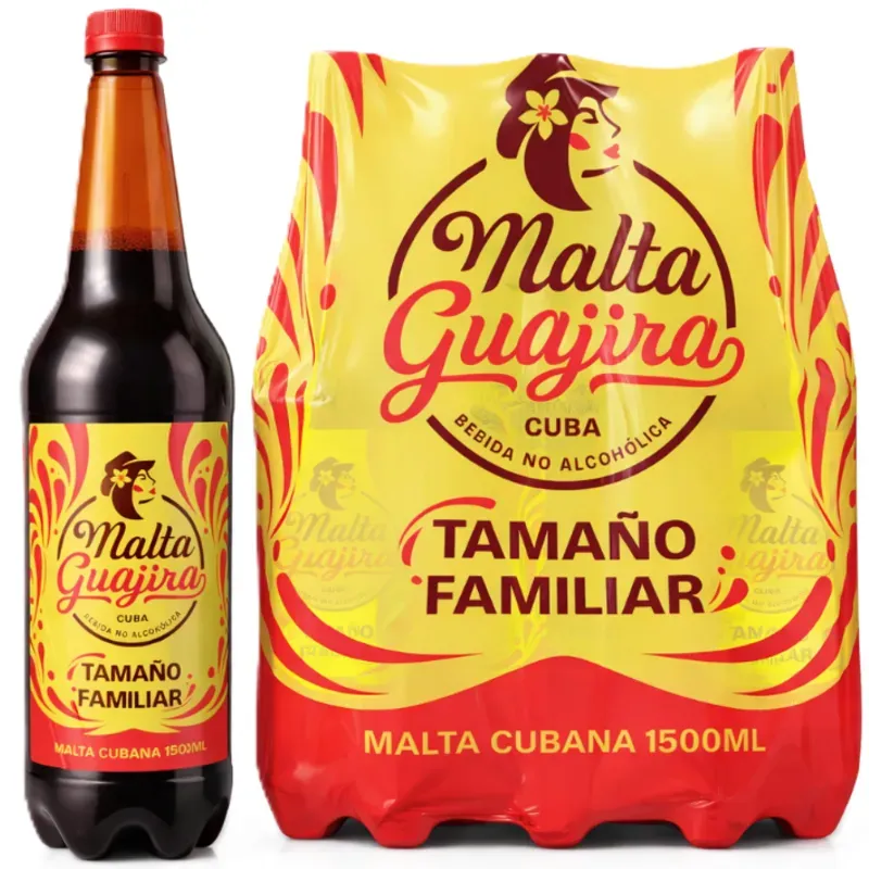 El producto en la imagen es Malta Guajira, una bebida no alcohólica cubana.