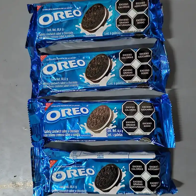Cuatro paquetes de galletas oreos de 6 unidades cada paquete