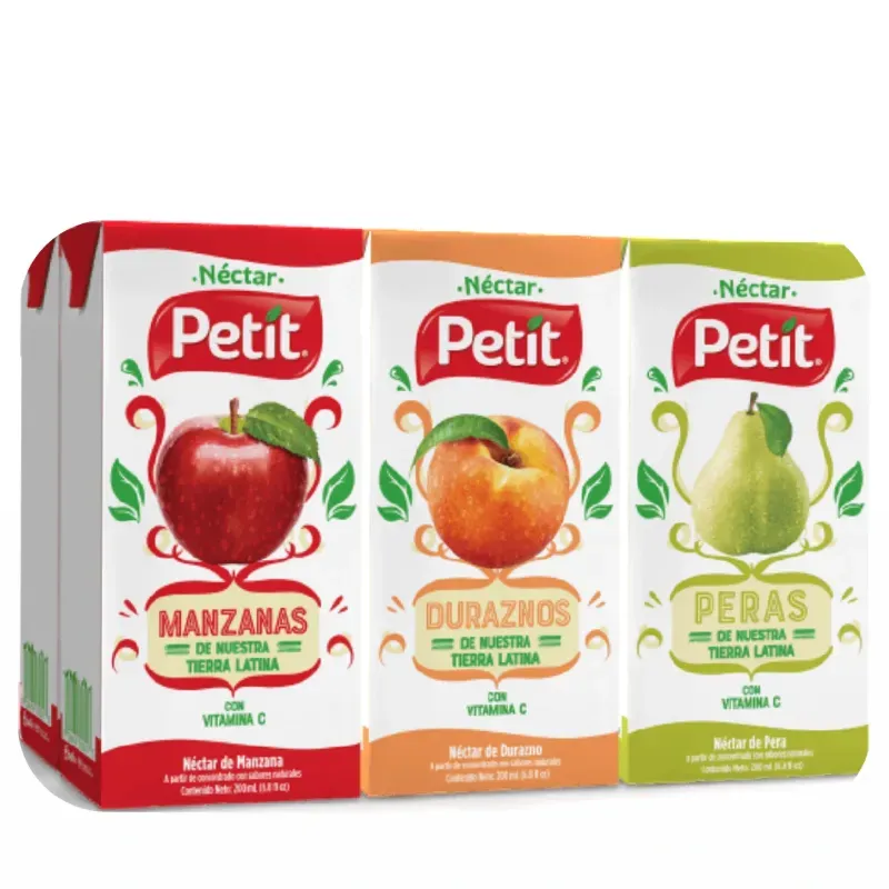 El paquete de Néctar Petit de 24 unidades surtidas (pera, manzana y melocotón/durazno) es una presentación común diseñada para familias o eventos, disponible en formatos de caja (Tetra Pak)