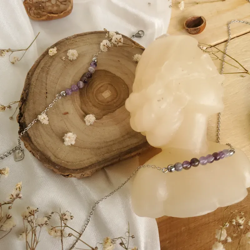Compuesto por cadena y manilla delicada elaboradas con esferas de piedra natural, su diseño evoca pequeñas órbitas de luz que descansan suavemente sobre la piel.