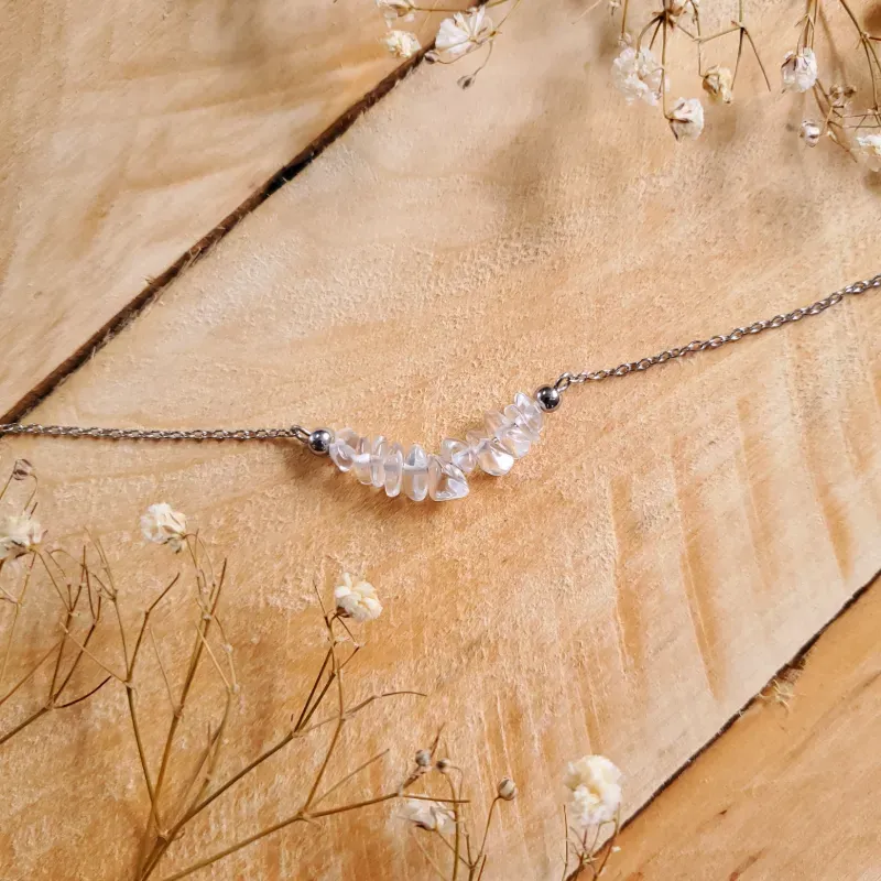 El Cuarzo Cristal aporta pureza, luz y amplitud, realzando la esencia femenina y mágica de una pieza pensada para acompañar momentos de intuición, belleza y encantamiento.