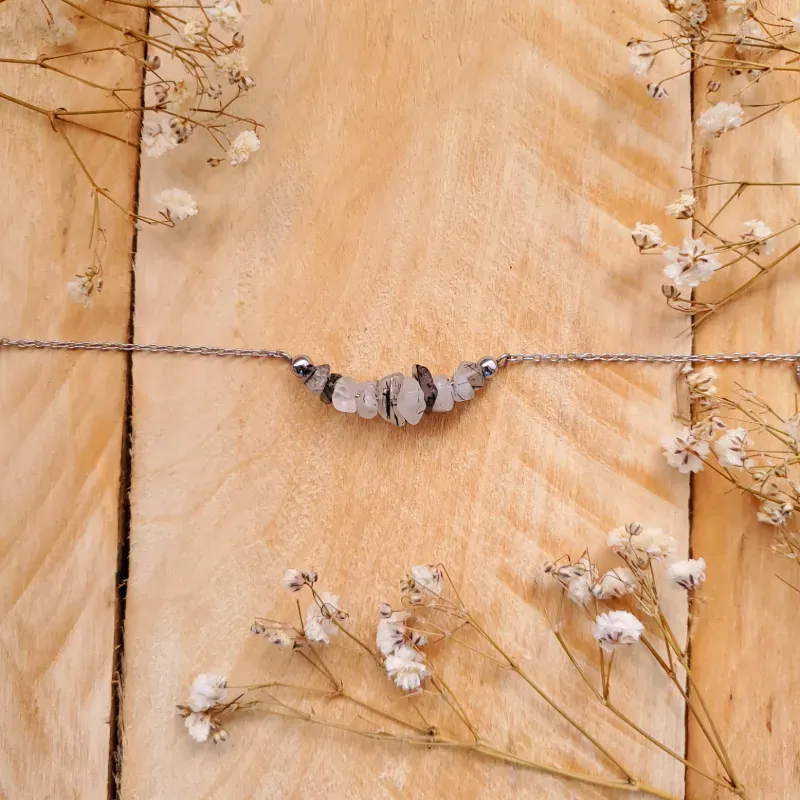 Esta versión se viste con la fuerza equilibrante del Cuarzo Turmalinado, una piedra que acompaña la transformación y la protección energética sin perder su esencia etérea.