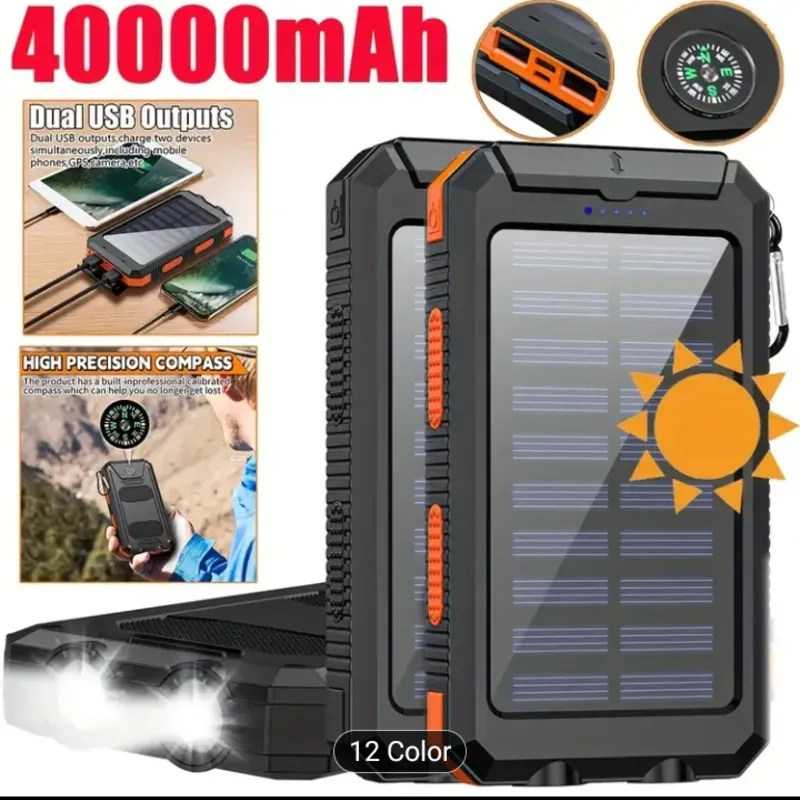 🛍Cargador Portátil Solar - Batería Externa de 40000 mAh para todos los teléfono celulares y dispositivos electrónicos, con puerto USB dual con USB-C, linterna y brújula.Larga duración, para viajes, camping y rutina diaria.