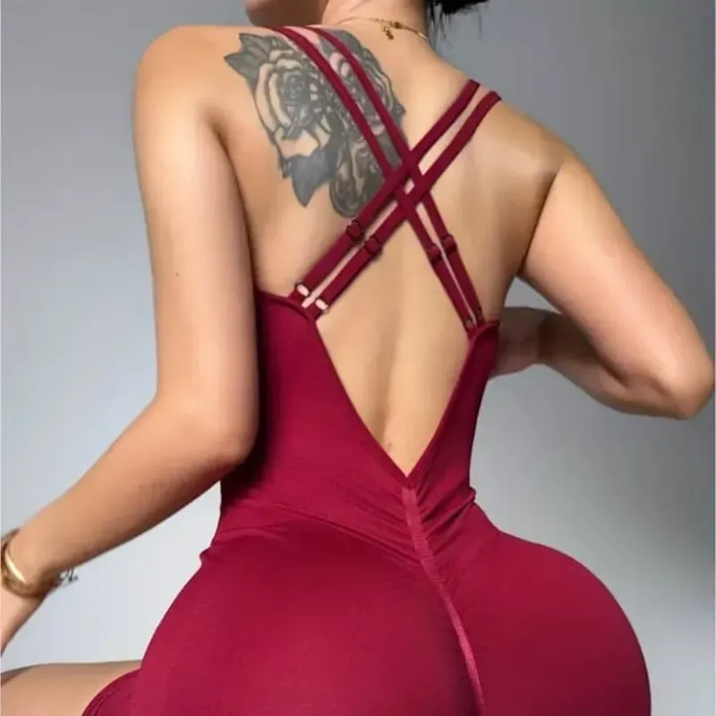 🛍 Mono color Rojo Vino con Espalda Cruzada con Tirantes , Levanta Glúteos