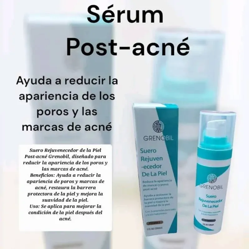 🛍Suero Rejuvenecedor de la Piel Post-acné Grenobil, diseñado para reducir la apariencia de los poros y las marcas de acné.