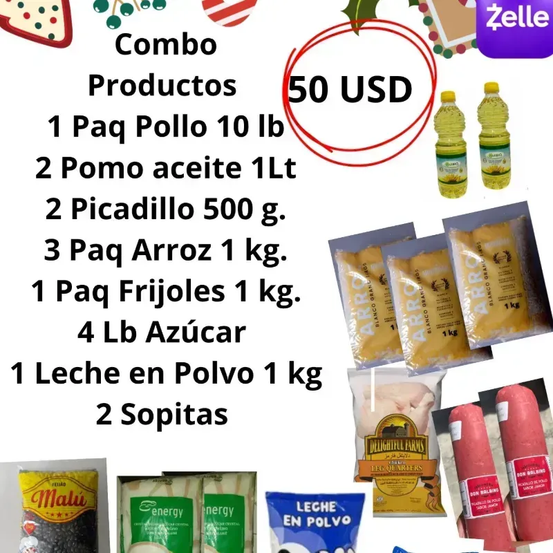 1 Paquete de Pollo 10 lb. 2 Pomos de Aceite 1Lt 2 picadillo 500 g. 3 kg de arroz 1 kg. de frijol negro 4 lb. de azúcar 1 Leche en Polvo 1kg. 2 sopitas.