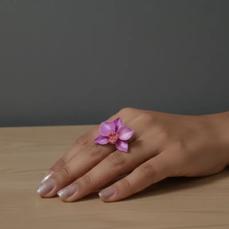 Anillo artesanal que presenta una orquídea en plena floración, diseñada para envolver el dedo con elegancia y realismo.