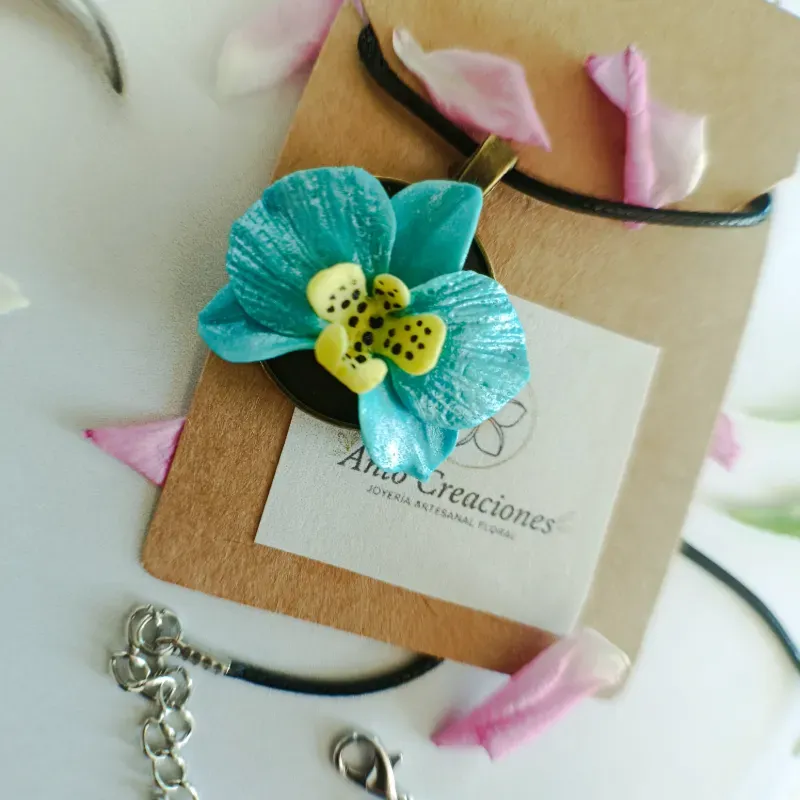 Réplica detallada de orquídea en tono turquesa vibrante con centro amarillo moteado. Arcilla polimérica con acabado satinado. Montura: Bisel de estilo antiguo y cordón de seda sintética.