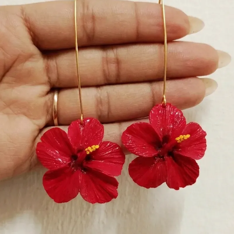 Pendientes largos de diseño artístico que presentan un hibisco en color rojo vibrante. Cada pétalo ha sido texturizado a mano para capturar la esencia natural de la flor. En arcilla polimérica de alta calidad.