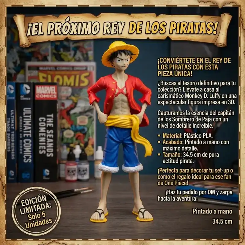Llévate a casa al carismático Monkey D. Luffy en una espectacular figura impresa en 3D de alta calidad.