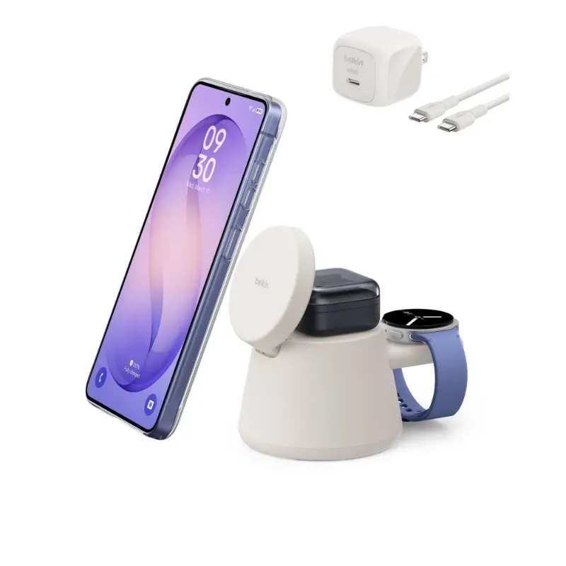 La estación de carga inalámbrica Belkin 3 en 1 Qi2 con 45W adaptador incluido. Carga simultánea iPhone hasta 25W (0-50% en 25 min), Apple Watch rápido y AirPods. Alineación magnética MagSafe, diseño compacto plegable o dock, refrigeración integrada. Ideal para escritorio o mesita de noche.