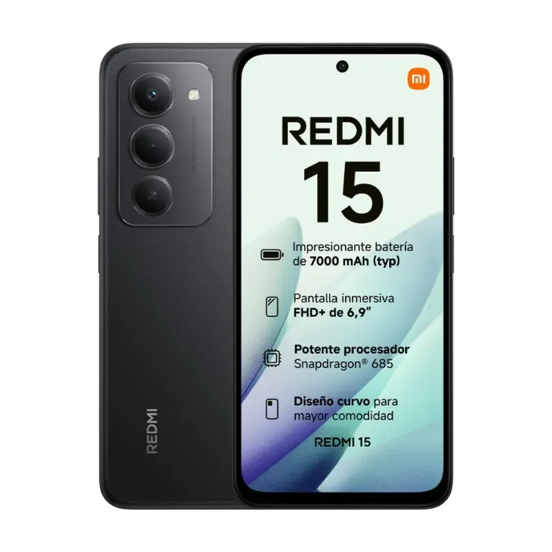 El Redmi 15 cuenta con pantalla IPS LCD de 6.9" FHD+ hasta 144Hz, procesador Snapdragon 685, RAM 4-8GB y almacenamiento 128/256GB expandible. Batería 7000 mAh con carga rápida 33W y reversa 18W. Cámara principal dual 50MP, Android 15 con HyperOS 2, IP64, diseño cuádruple curvado y peso 224g.