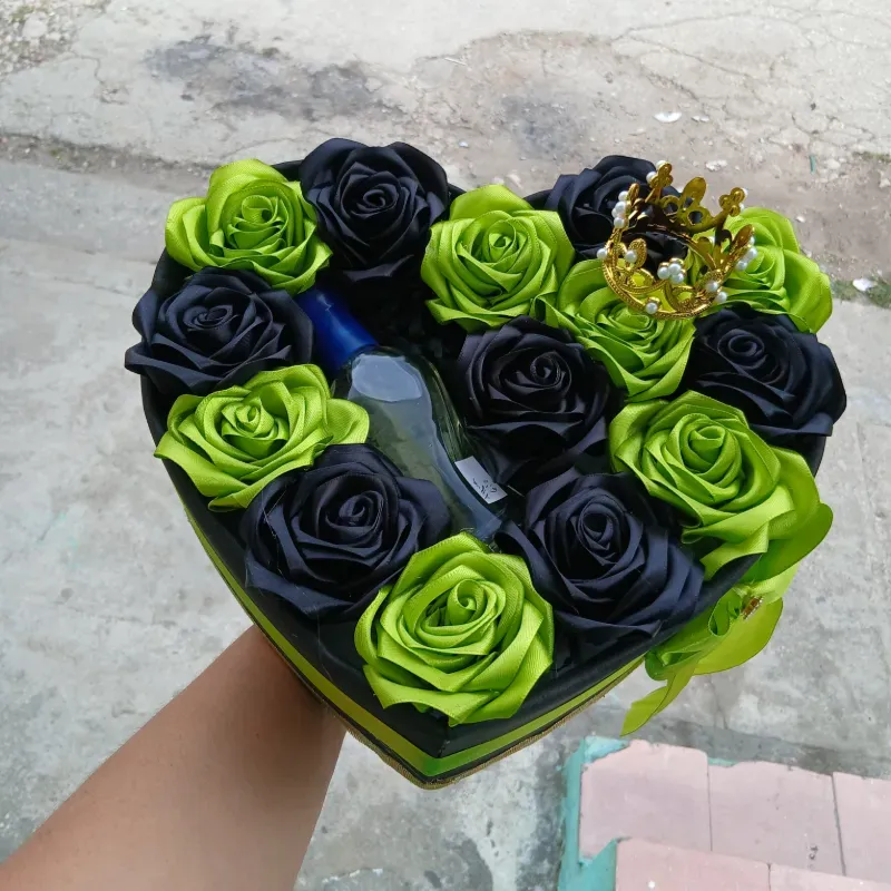 Caja de carton forrada y decorada en forma de corazon con rosas eternas(el color lo elige usted) y perfume
