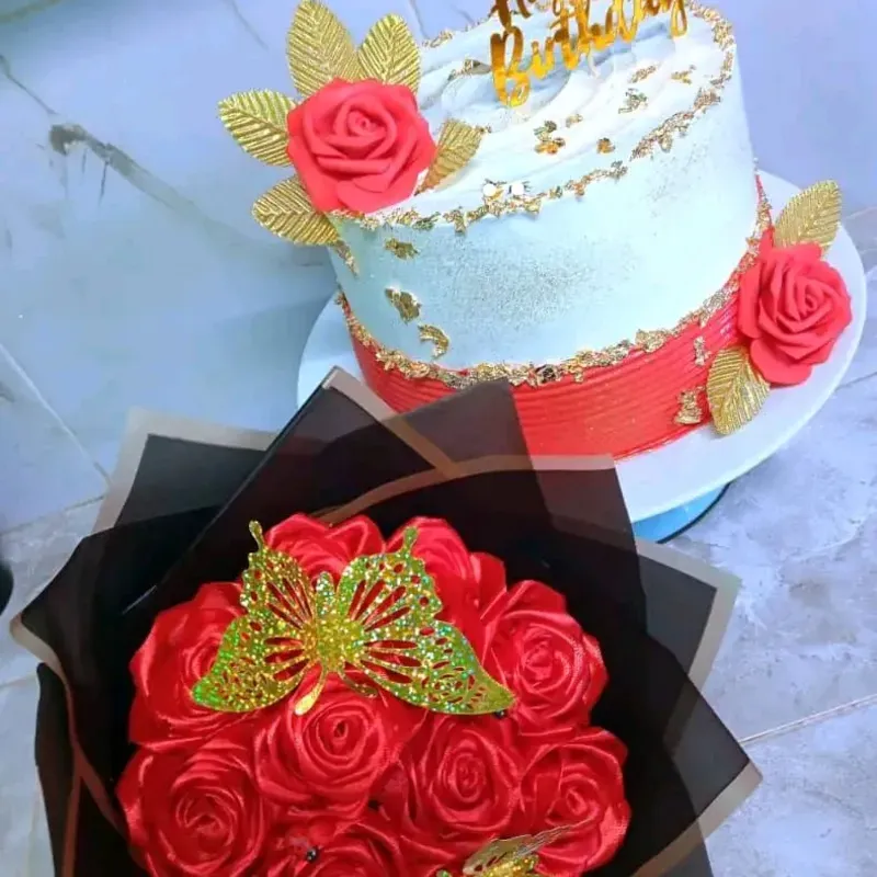 Cake doble relleno + ramo de 10 rosas eternas