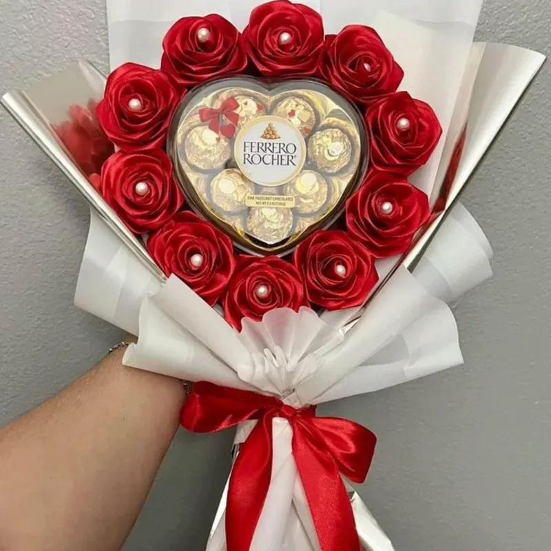 Ramo de corazon con rosas eternas y caja de bombones originales( no ferrero rocher)