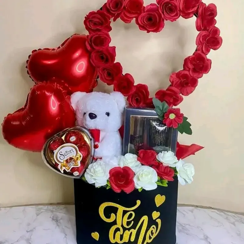 Caja decorada en forma circular incluye: - Oso de peluche - corazon de rosas eternas - cajita de bombones - globos decorativos en forma de corazón - set de crema y colonia - flores eternas decorativas