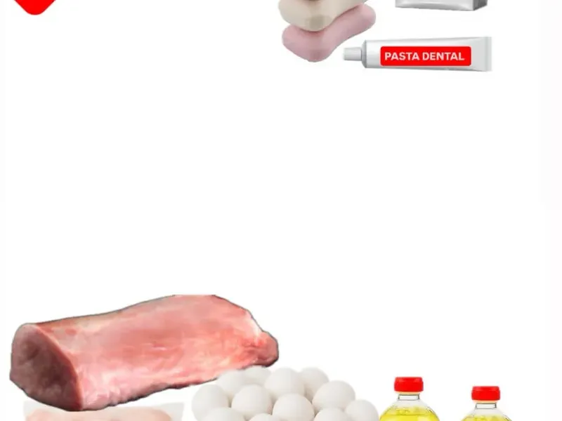 5 Lb Carne de Cerdo 5 Lb de Pollo 1 Pomo de Aceite 2 Pure de Tomate 12 Huevos 10 Lb de Arroz 5 Lb de Frijoles 2 Espaguetis 3 Paquetes de Salchichas 10 Uni c/u 1 Leche en Polvo 2 lb De Queso Criollo REGALO 1 Paquete de detergente 5 Jabones de Baño 1 Pasta dental PRECIO EN USD