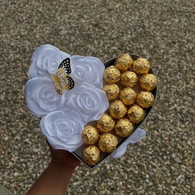 Caja con 5 Rosas Eternas y 15 Bombones Ferreros , 1 Mariposa, Lazo