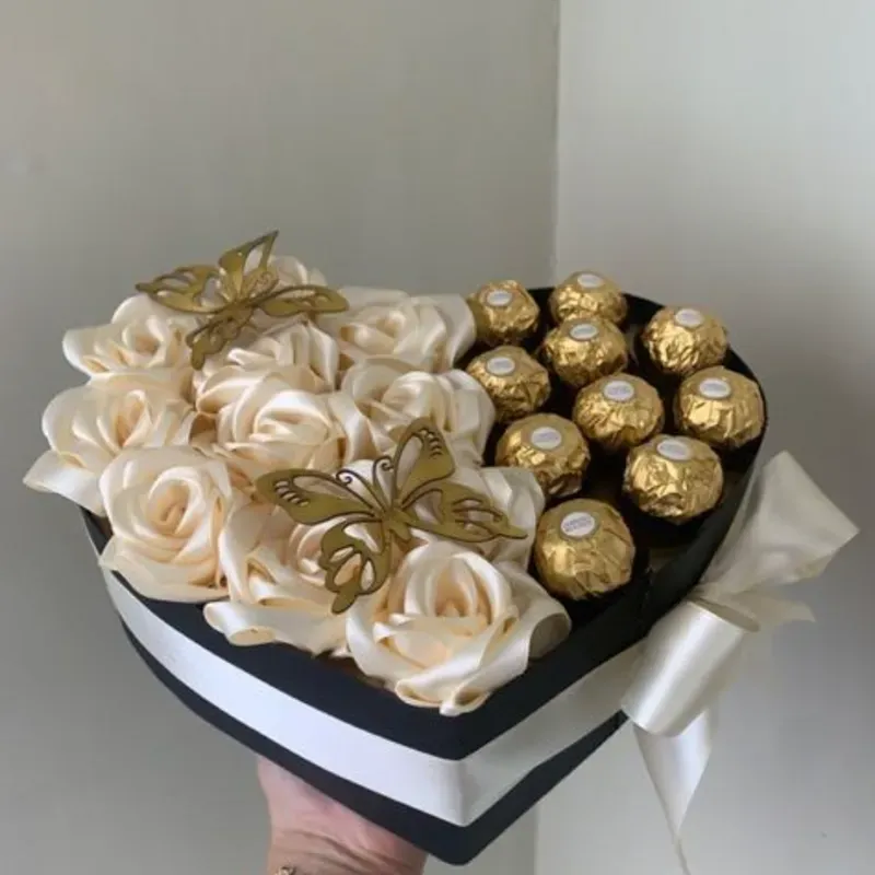 Caja decorada con 11 Rosas Eternas y 10 Bombones Ferreros , dos mariposas, lazo