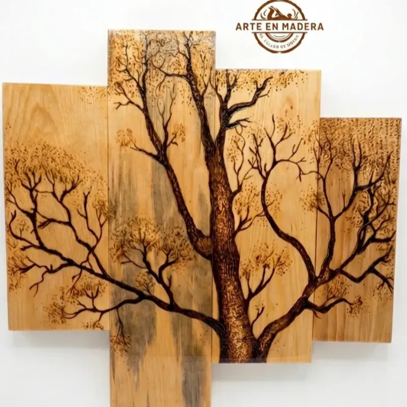 Cuadro pintado a mano con tecnica de pirograbado sobre madera con medidas