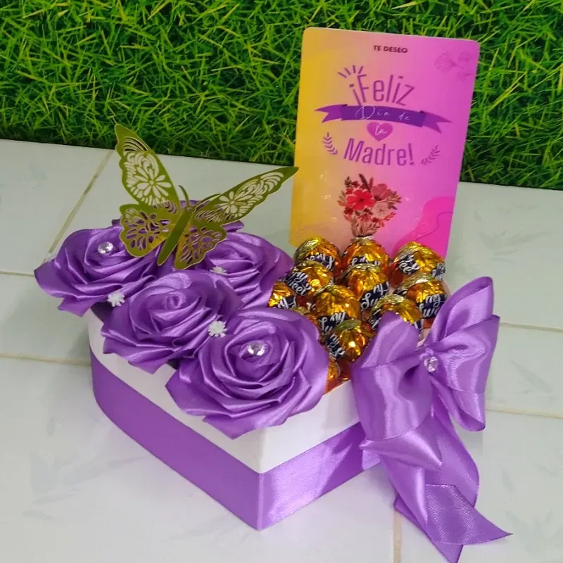 - Caja en forma de corazón con bombones y rosas eternas ( color a elegir ).
