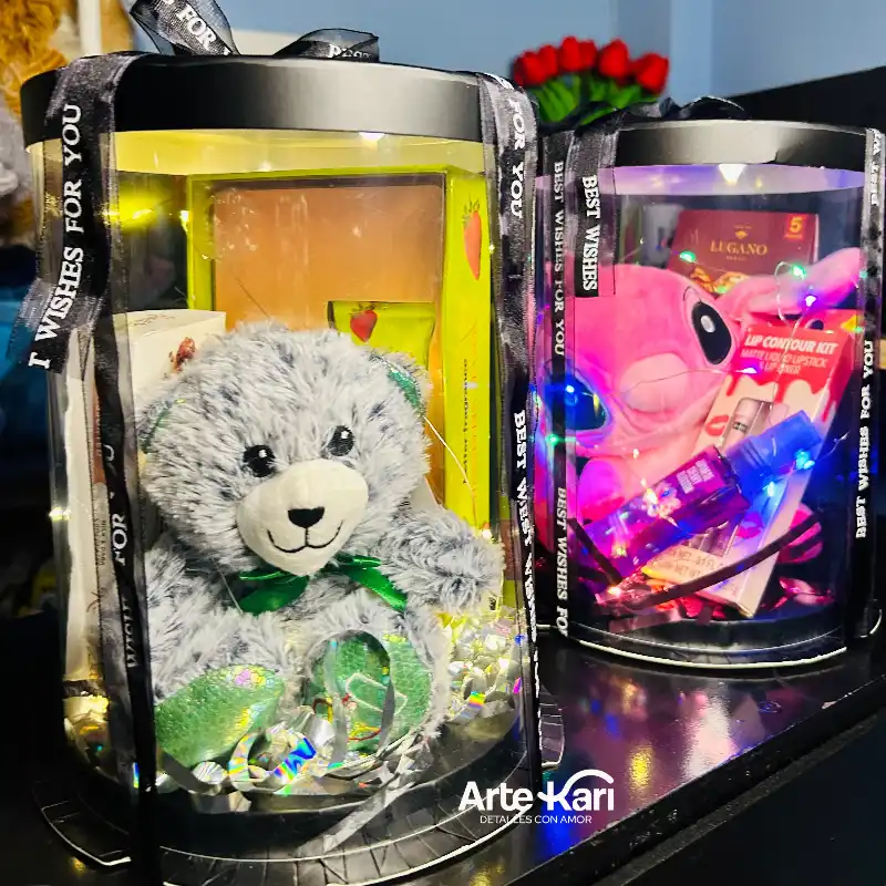 🎁Incluye: ✅caja transparente con luces 💡 ✅1 set de perfume y crema ( a elegir) ✅1 peluche pequeño ( puede cambiarlo) ✅1 caja de bombones