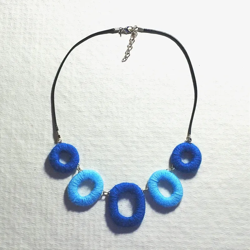 Collar con piezas geométricas unidas con pequeñas aros metálicos y cordón