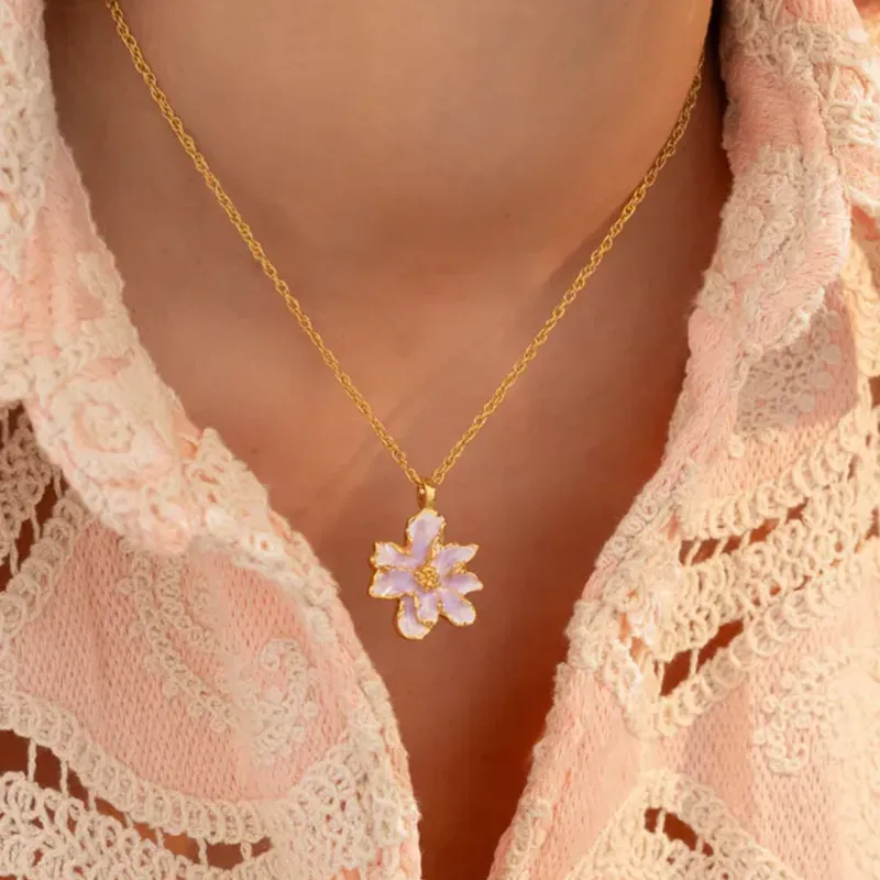 Collar con cadena tipo espiga pequeña y dije con argolla en forma de flor, elaborado con aleación de metales y baño de oro o plata, finalizado con laca de alta resistencia.