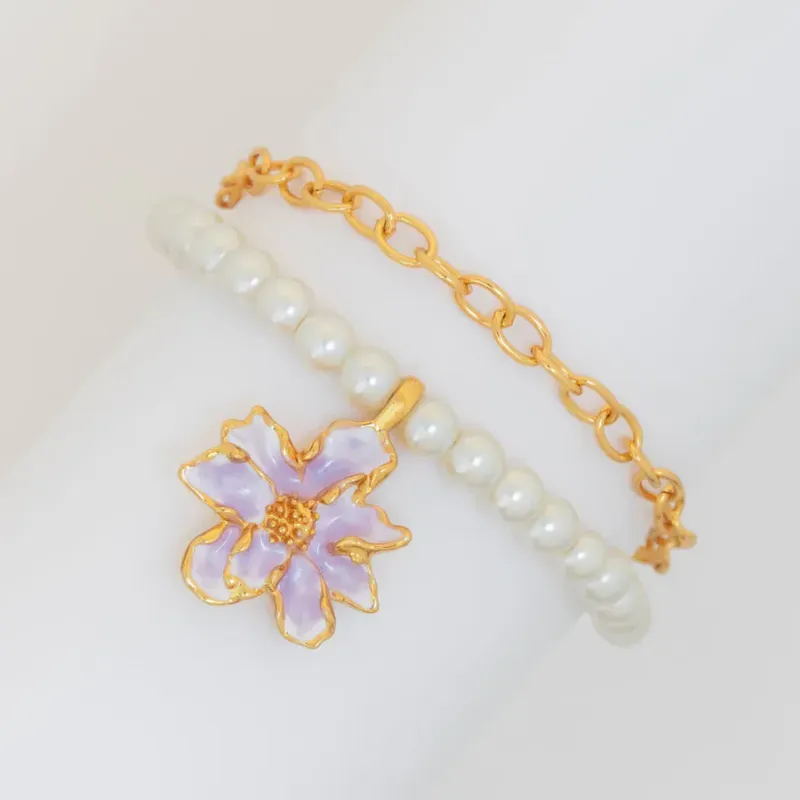 Pulsera con cadena de óvalo mediano y perla de vidrio beige acompañada de dije de flor en tamaño maxi. Elaborada con aleación de metales y baño de oro, finalizada con laca de alta resistencia.