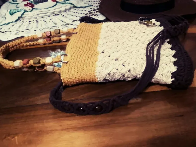 Cartera pequeña portacelular con accesorio de madera.