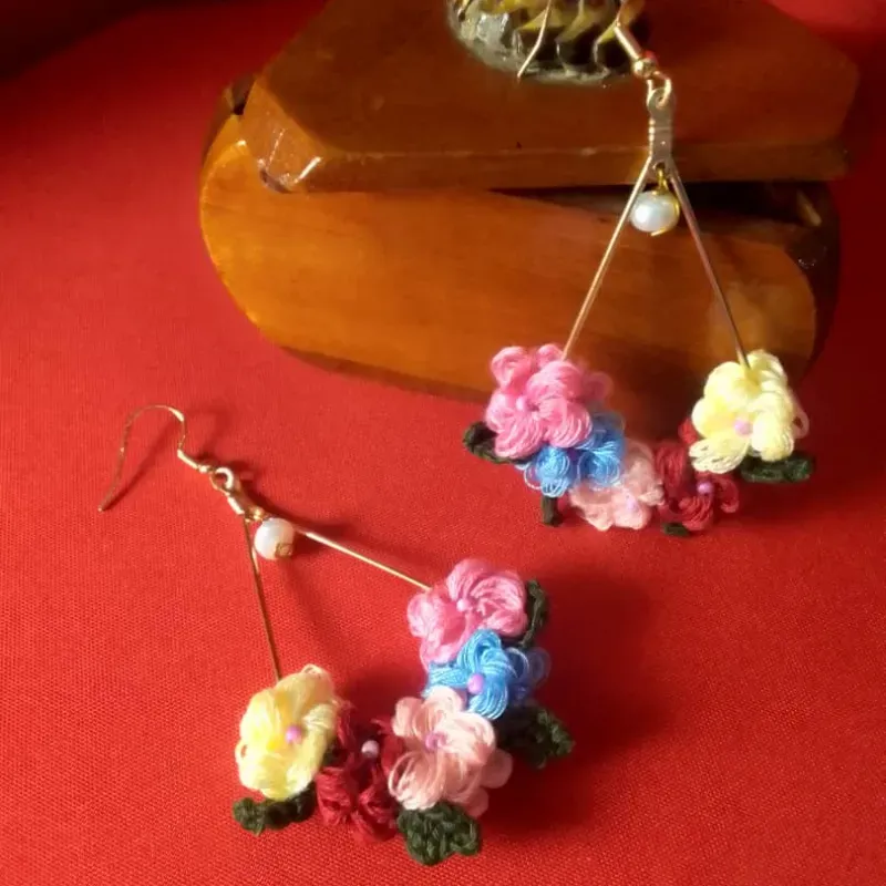 Y se unieron todas las miniflorecitaas en otro modelito de (Jardín primaveral) 🤗😊 ésta vez con minihojitas verde olivo al descuido... Y un detallito de perlita que cuelga. Hilo algodón 💯 Verde olivo poliéster