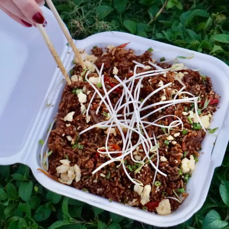Arroz salteado al wok con vegetales, pollo, jamón, huevo y salsa de soja