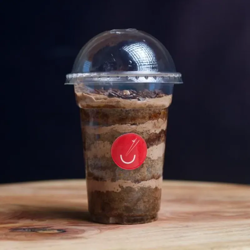 Postre frío servido en capas, alternando panetela y crema batida de chocolate