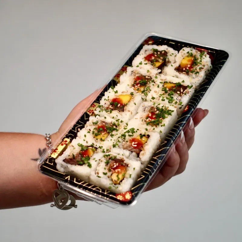 Arroz de sushi, alga nori, atún marinado en salsa de la casa, mango, toque de sriracha pura