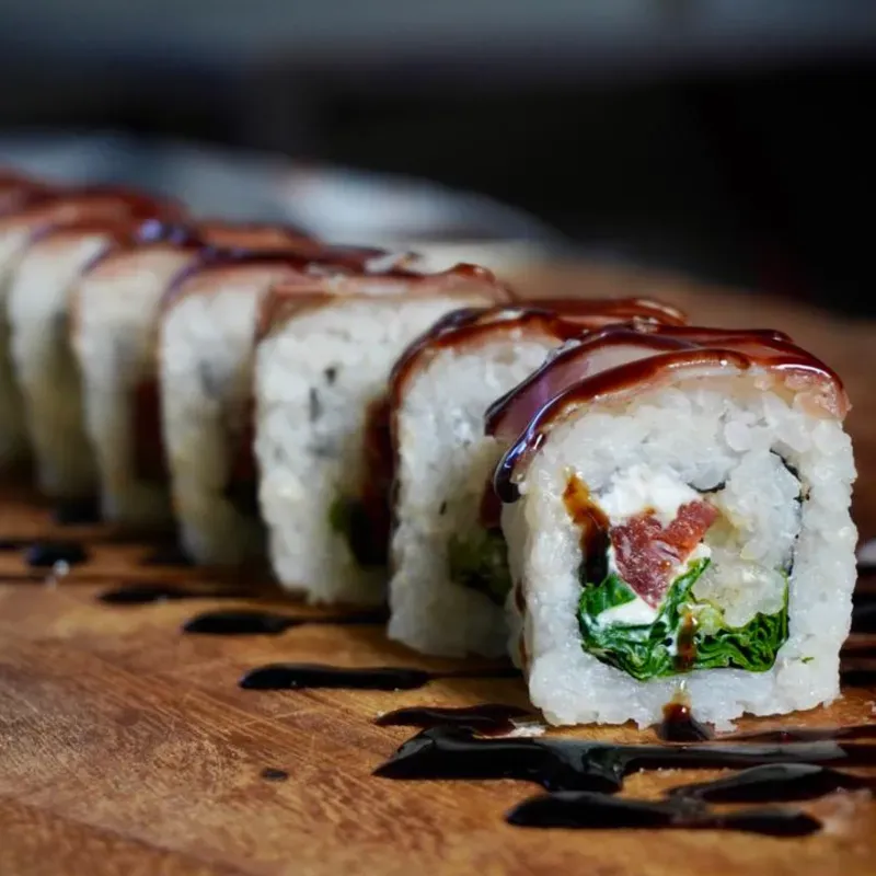 Arroz de sushi, alga nori, chorizo ibérico, queso crema, rúcula, jamón serrano exterior y vinagre balsámico