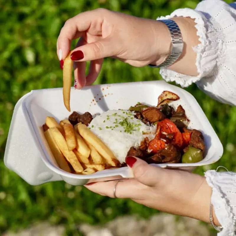 Lomo salteado al wok con vegetales de estación, salsa de la casa a base de soja, vinagre, jugo de tomate y azúcar, acompañado de papas fritas y arroz blanco