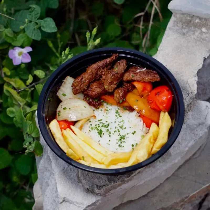Lomo salteado al wok con vegetales de estación, salsa de la casa a base de soja, vinagre, jugo de tomate y azúcar, acompañado de papas fritas y arroz blanco