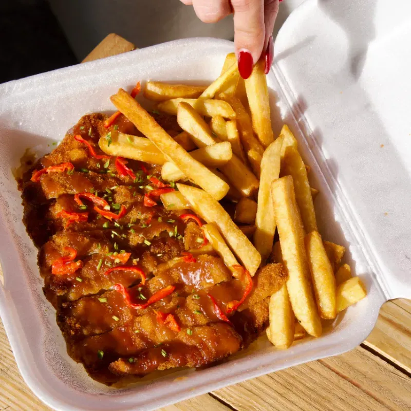 Filete de cerdo empanizado con salsa de la casa a base de soja cítrica, miel, ajo y jengibre, acompañado de arroz blanco y papas fritas
