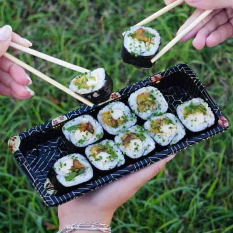 Arroz de sushi, alga nori, pollo teriyaki, pimientos asados en salsa ponzu y plátano maduro frito