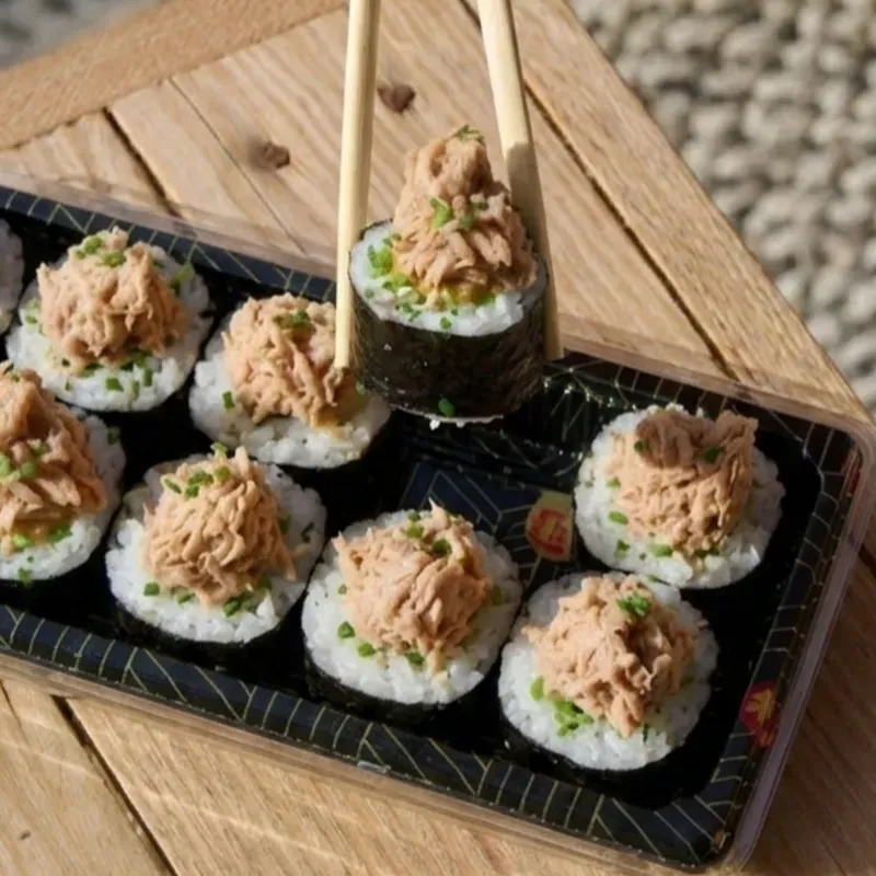 Arroz de sushi, alga nori, calabaza caramelizada con canela, ajo porro, topping de langosta marinada en salsa de la casa