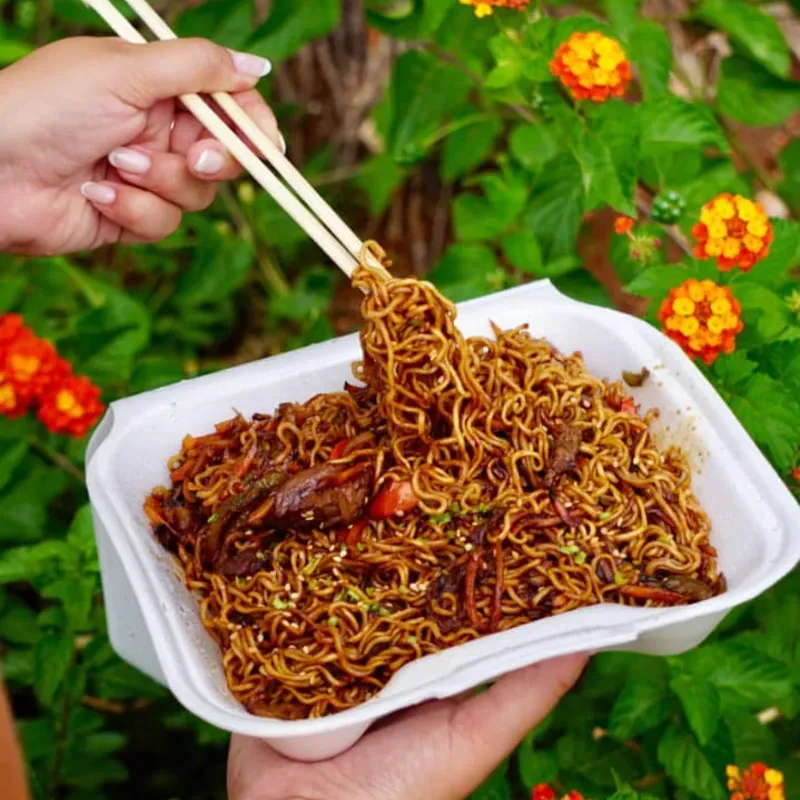 Fideos salteados al wok, vegetales, salsa de la casa a base de soja y aceite de sésamo, con res