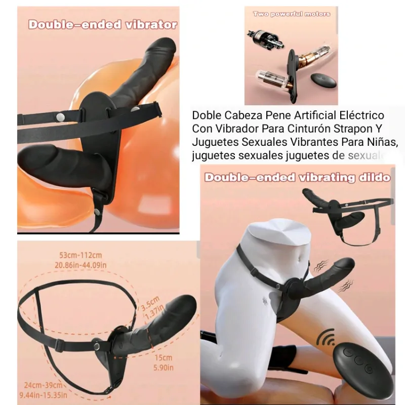 Fabuloso arnés de cuero más doble dildo y 8 modos de vibración, color negro, estriado para mayor sensación y placer.