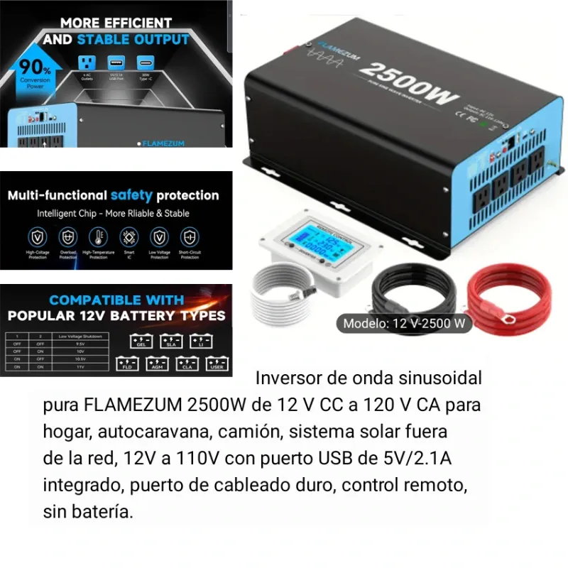 Inversor de 2500w nominales y un pico máximo de 4000w, ideal para neveras, refris y hasta para cocinar si compra el kit de dos baterías, sino no se preocupe que con una batería también se puede pero obviamente le durará menos la carga para ese día, si además adquieres un regulador solar de 40-60Amperios y un panel de 500-615w ya tiene una fuente de energía por mínimo 5 años con cero inversión.