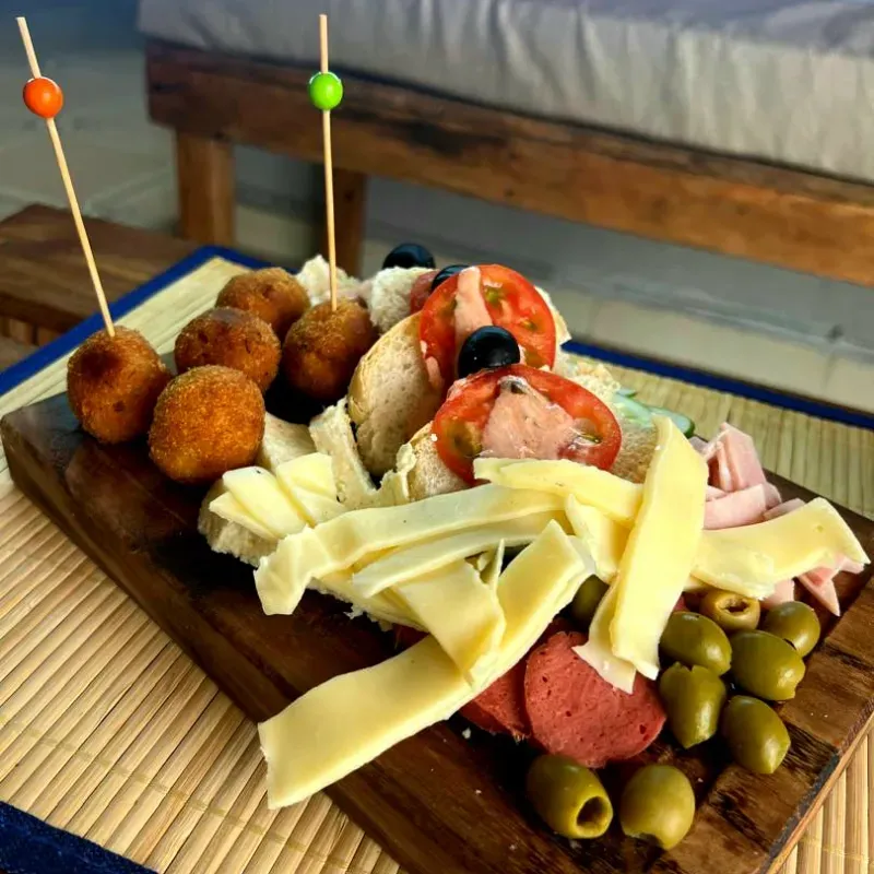 Un surtido de diferentes productos ,muy ameno para compartir con bebidas refrescantes, jamon quesos,aceitunas negras y verdes,tostadas con salsa,croquetas de la casa y chorizo .