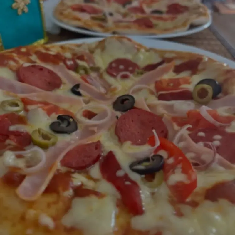 Pizza de queso gouda con jamon ,aceitunas negras y verdes,cebolla y chorizo