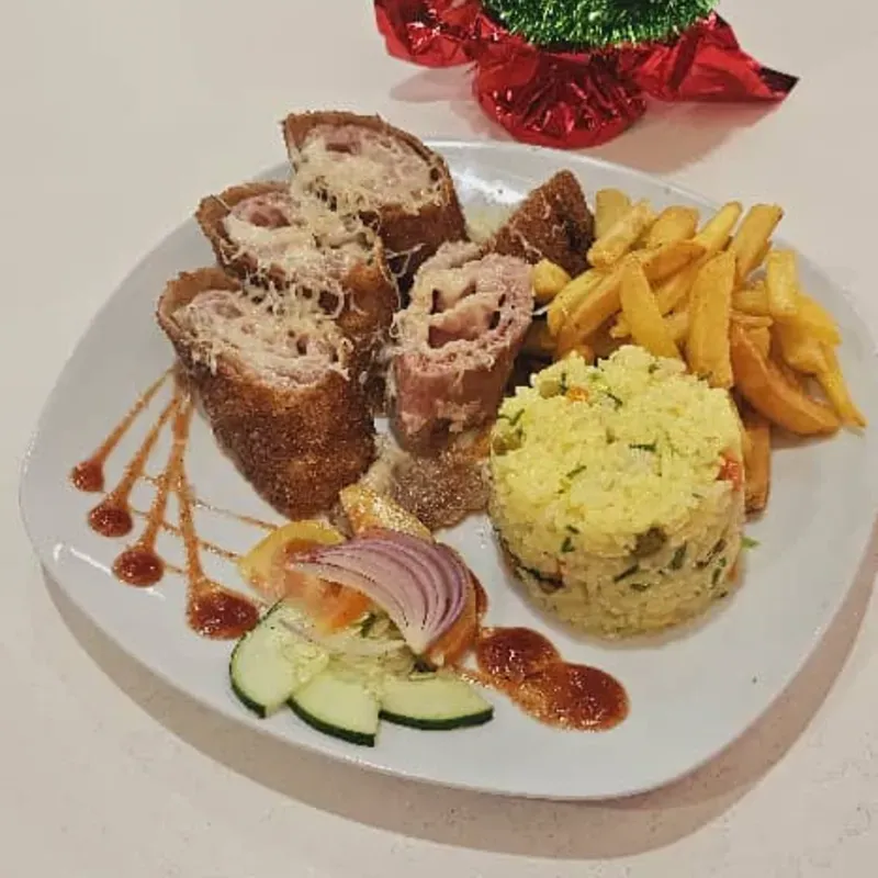 Bistec de cerdo empanado relleno de jam贸n y queso gouda, con papas fritas