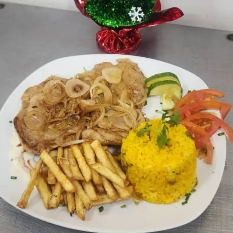 Media libra de bistec de cerdo magro, cebollas salteadas y papas fritas.