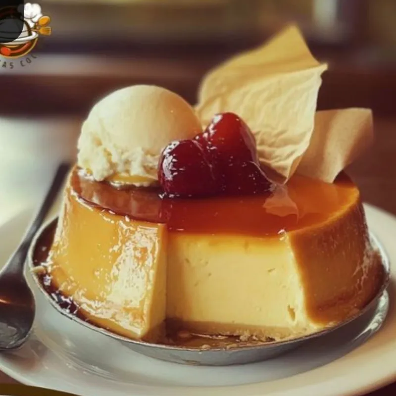 Una bola de helado sabor de su elección con flan, decorado con grajeas y glaseado de sirope