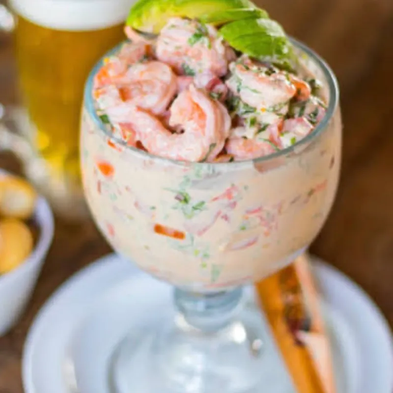 Camarones cocidos y pelados, servidos sobre una cama de lechuga fresca, acompañados de aguacate en dados y nuestra salsa cóctel casera (mayonesa, kétchup, salsa inglesa, tabasco y un toque de brandy).
