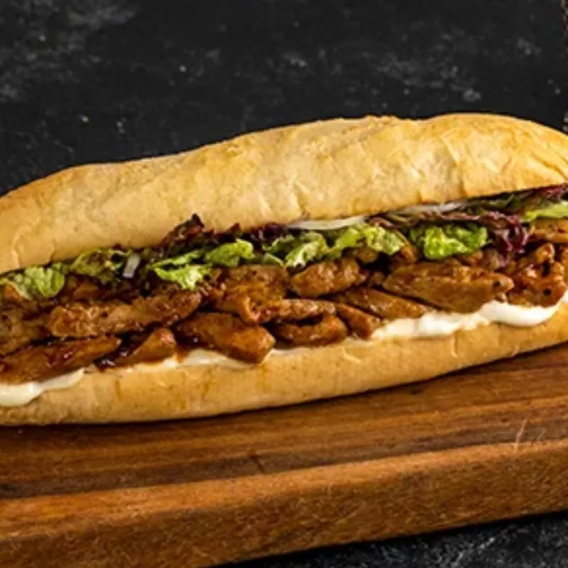 Pan rústico o pan de molde tostado, relleno de jugoso lomo de cerdo a la plancha, lechuga, tomate, cebolla caramelizada y salsa alioli o mostaza y miel. Acompañado de patatas fritas caseras. Contundente, sabroso y adictivo.